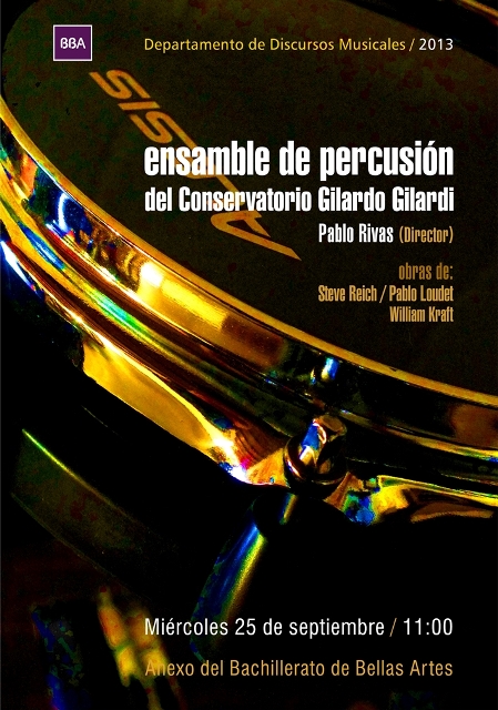 El Departamento de Discursos Musicales los invita al Concierto de Composición Experimental en el que se presentará el Ensamble de Percusión del Conservatorio Gilardo Gilardi bajo la dirección de Pablo Rivas, que interpretará obras de Steve Reich, Pablo Loudet y William Kraft. El concierto se realizará el miércoles 25 de septiembre a las 11 Hs. en el Salón Auditorio del edificio Anexo (8 nº 1371).